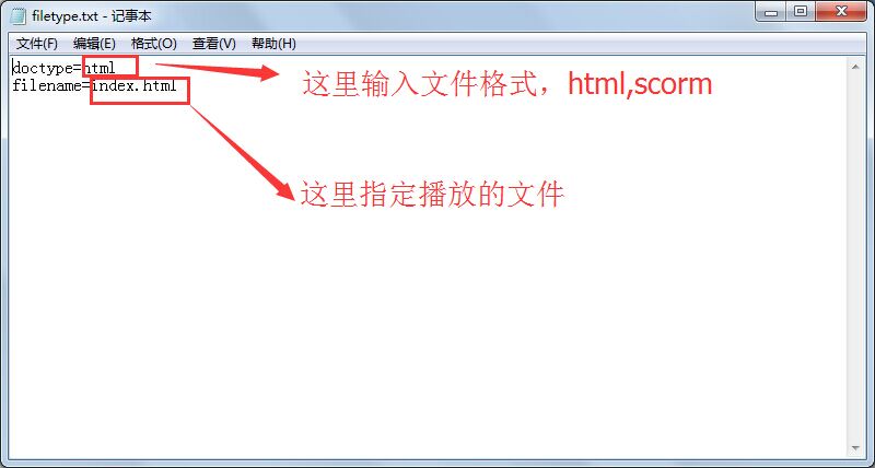 2、filetype.txt里添加doctype指定上传的格式,只能是html或者scorm,以及播放的文件filename,具体如下图