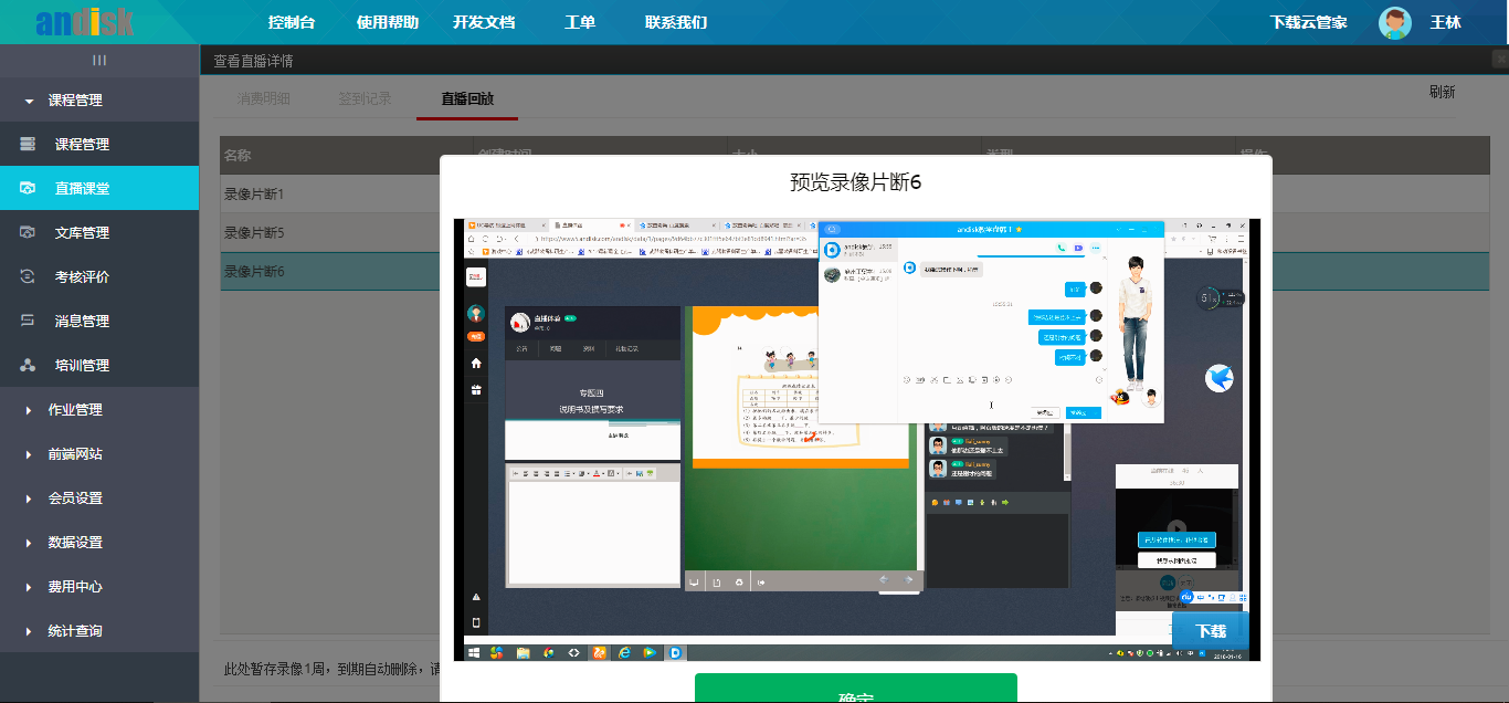 全程自动录像,关闭直播后,也不用担心用户看不到,后来进入的用户将直接观看回放 。后台可以将回放存下来编辑后作为资源,放到在线视频课程里使用...